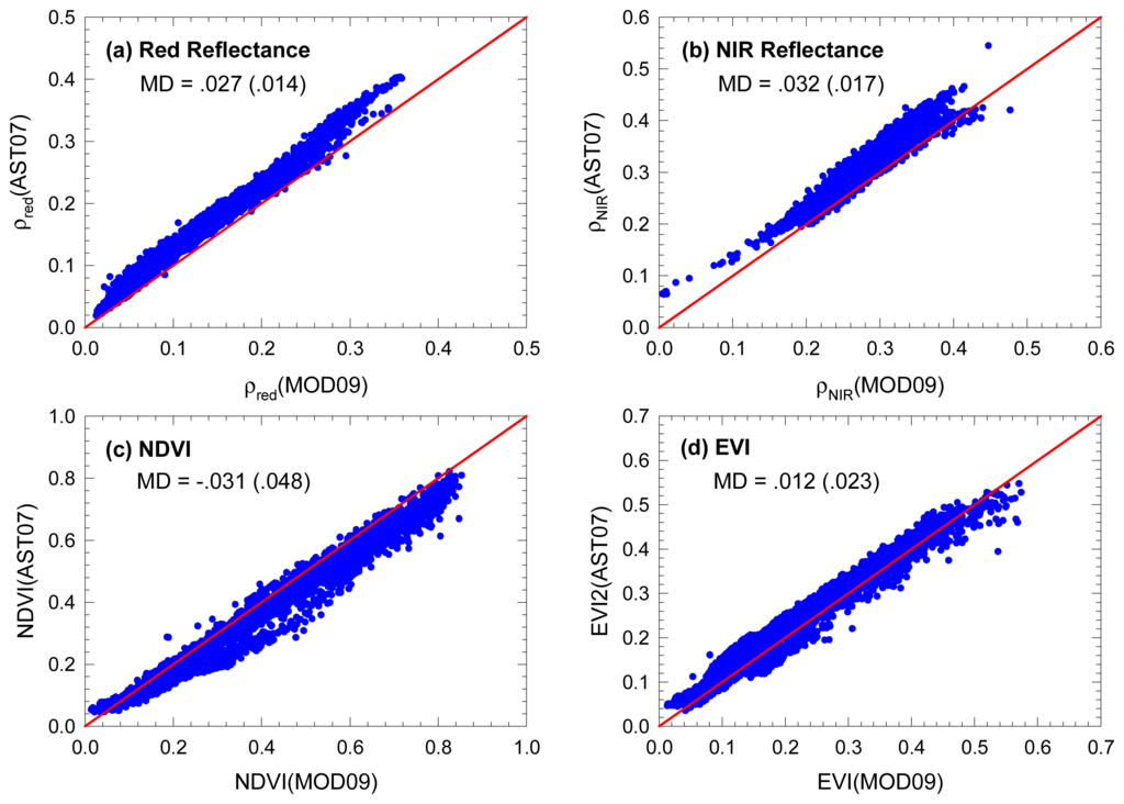 Scatterplots of ASTER vs. MODIS surface reflectance and vegetation indices: (a) red reflectance, (b) NIR reflectance, (c) NDVI, and (d) EVI2 vs. EVI. MDs in the plots stand for mean differences and the values in the parentheses were standard deviations of the differences.