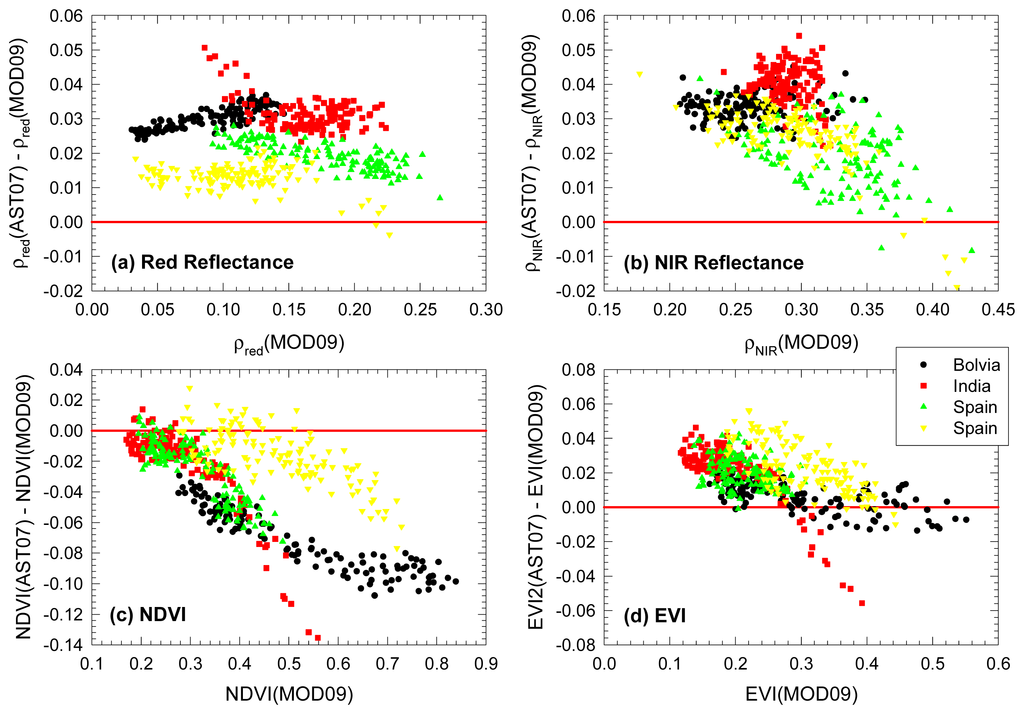 In order to assess the large scatter observed in Figure 3, we randomly selected four scenes and plotted differences of ASTER and MODIS reflectances/vegetation indices against the latter. Scene-to-scene variability of these differences (relationships between ASTER and MODIS variables) were large (Figure 4). Red reflectance differences were nearly constant throughout its dynamic range for each scene, but their magnitudes differed significantly among them (Figure 4a). NIR reflectance differences also differed among scenes (Figure 4b). One dataset from Spain (the light green triangles in Figure 4b) had large scatter and differences were smaller in general, whereas another dataset from India (the red squares in Figure 4b) had slightly larger differences than the others.