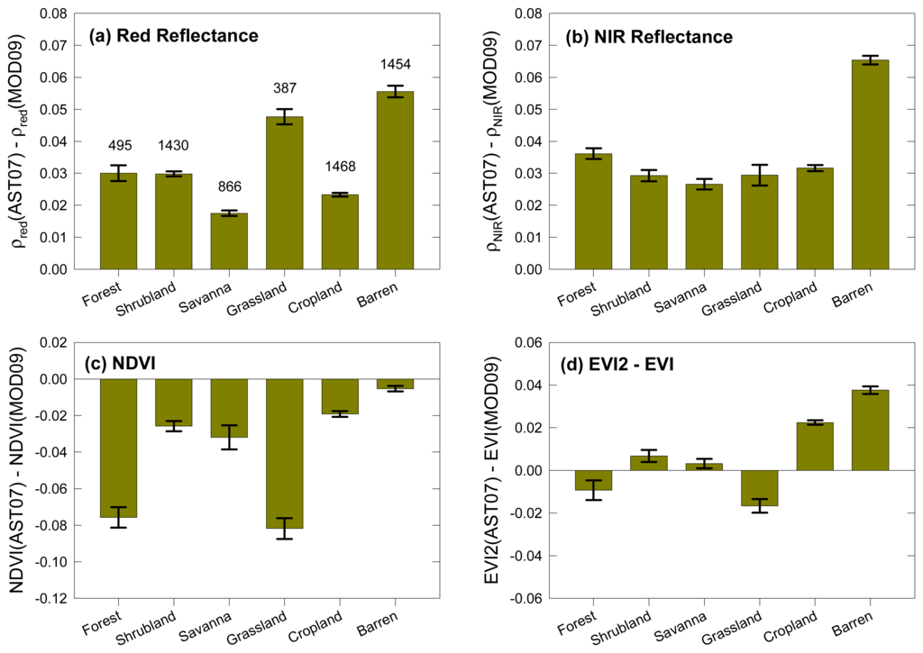In Figure 5, ASTER vs. MODIS differences (AST07 minus MOD09) are summarized by land cover types. Some land cover dependencies existed in all of the four radiometric variables. NIR reflectance differences were, however, nearly at the same level of ∼.03 except for the barren cover type (Figure 5b). For red reflectance, MD was the largest for barren and the second largest for grassland (Figure 5a). For the NDVI, it was large not only for grassland, but for forest as well (Figure 5c). For the EVI2/EVI, MD was the largest for barren followed by cropland and grassland, but it was positive for the cropland and negative for the grassland (Figure 5d). Smaller MD appeared to be associated with the savanna land cover type for which red and NIR reflectance differences and EVI2/EVI difference were the smallest (Figure 5a,c,d). Although these observations can be made, land cover dependencies of differences did not appear to be consistent across the four radiometric variables.