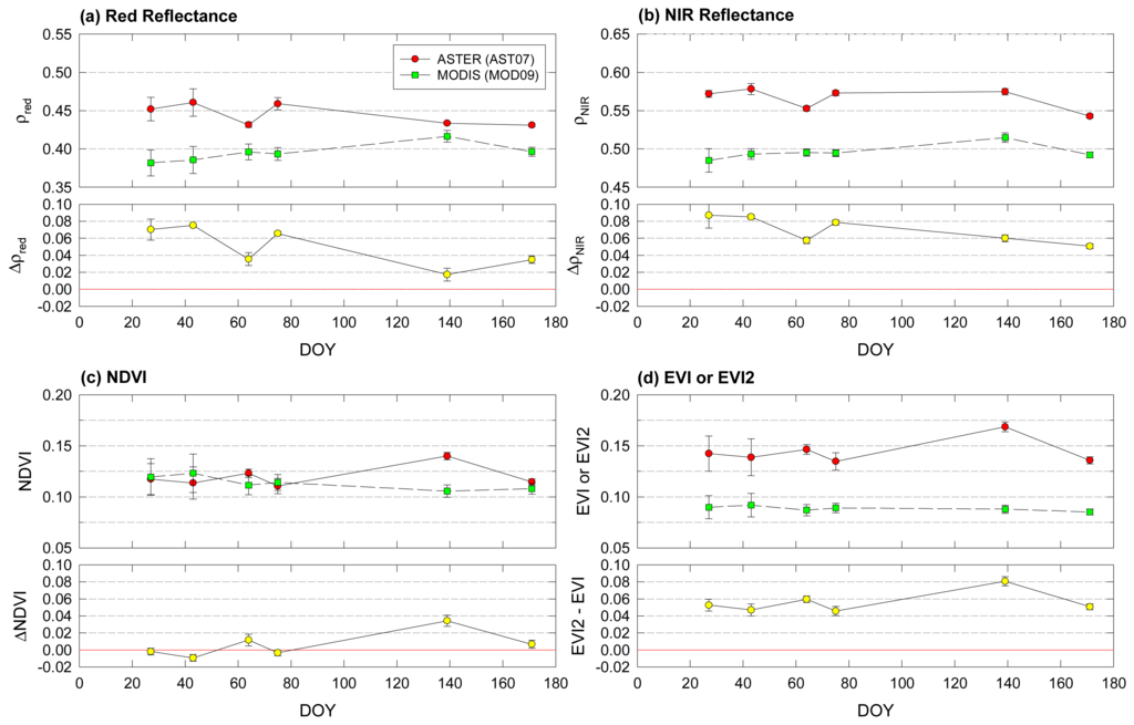 Time series plots of the ASTER and MODIS four radiometric variables and their differences from the desert site are shown in Figure 6. ASTER values were generally higher and exhibited more short-term variations (no systematic trend) than those of MODIS (Figure 6). While MODIS red and NIR reflectances changed, the changes were rather monotonic with their values first increasing gradually and then decreasing (Figure 6a,b, top). MODIS NDVI changed very little and MODIS EVI remained the same (Figure 6c,d, top). ASTER vs. MODIS mean differences (AST07 minus MOD09) were also highly variable and did not show a strong systematic trend with respect to time (Figure 6). Red reflectance differences had the largest variability, ranging from .02 to .08 (Figure 6a, bottom). Overall, differences between ASTER and MODIS products can not be considered temporal-dependent.