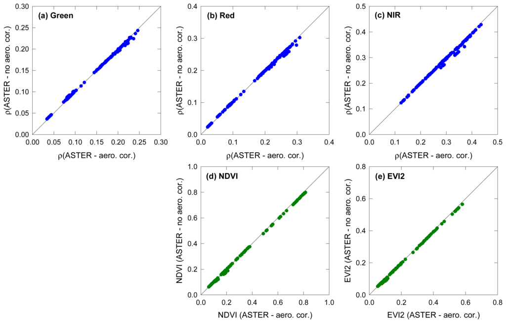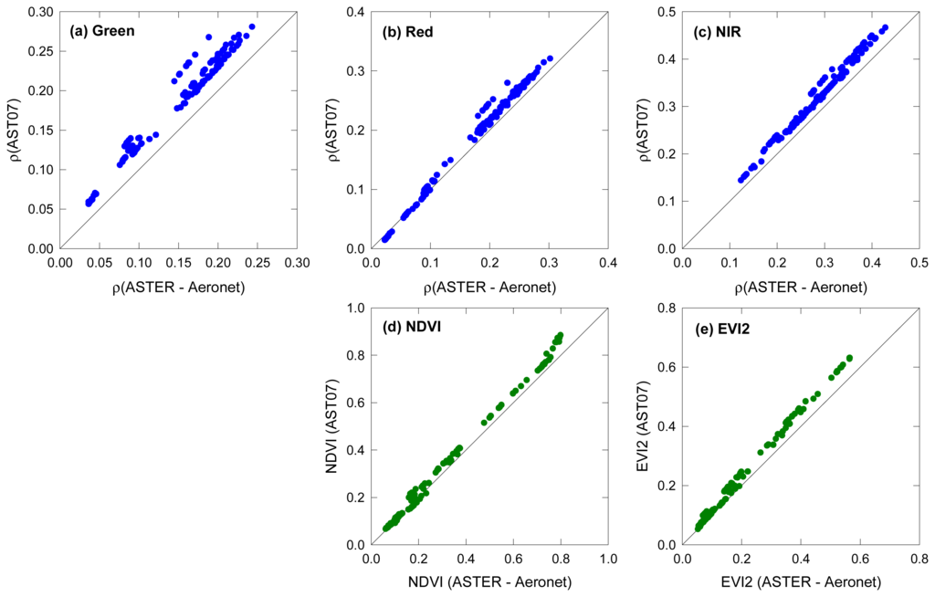Scatterplots of AST07 vs. atmospherically-corrected ASTER data using in situ Aeronet data for (a) green, (b) red, and (c) NIR reflectances, and (d) NDVI and (e) EVI2. These “in-house” atmospheric corrections of ASTER data were performed by setting aerosol optical thickness to zero, simulating the actual ASTER atmospheric correction scenario.