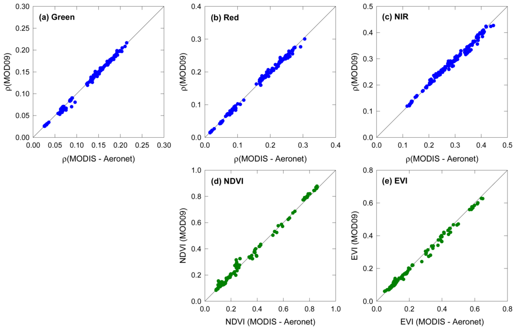 Scatterplots of MOD09 vs. atmospherically-corrected MODIS data using in situ Aeronet data for (a) green, (b) red, and (c) NIR reflectances, and (d) NDVI and (e) EVI.