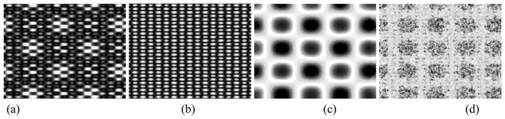 - Connecting all the local maxima and minima along rows using constructed smooth cubic splines to get upper envelope uer and lower envelope ler. Similarly, upper envelope uec and lower envelope lec along columns are also obtained. The mean plane ul is defined:Then, the difference between I0 and ul isThis is one iteration of the sifting process. Because the value of ul decreases rapidly for the first several iterations and then decreases slowly, this suggests that the appropriate number of iterations can be used as the stopping criterion. Hence, the appropriate number of iterations to build IMFs is used in this paper. This sifting process is ended until ω1 becomes an IMF. The residue is obtained by: