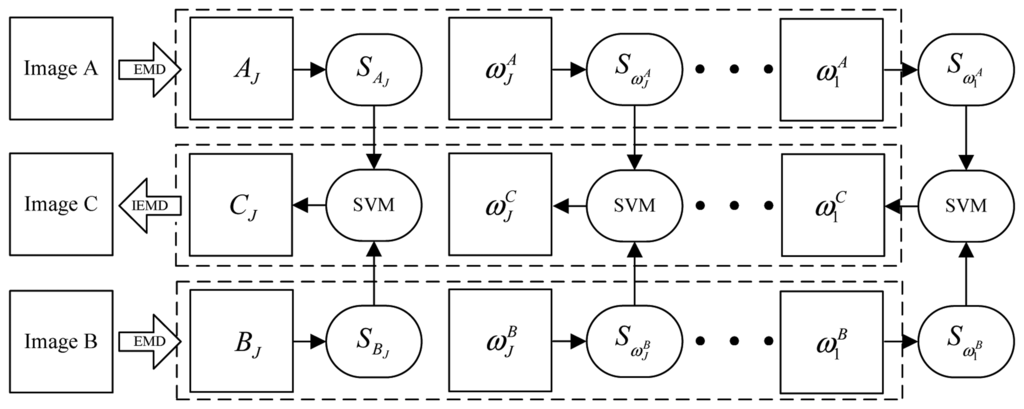 Here, the processing of two images A and B is considered, though the algorithm can be extended to handle more than two. Each multifocus image is firstly decomposed by EMD into one residue and a series of intrinsic mode functions (IMFs). Then a SVM is trained to determine which IMF plane is clearer at each location at each level. In the end, the focused image is recovered by carrying out the inverse EMD (IEMD).
