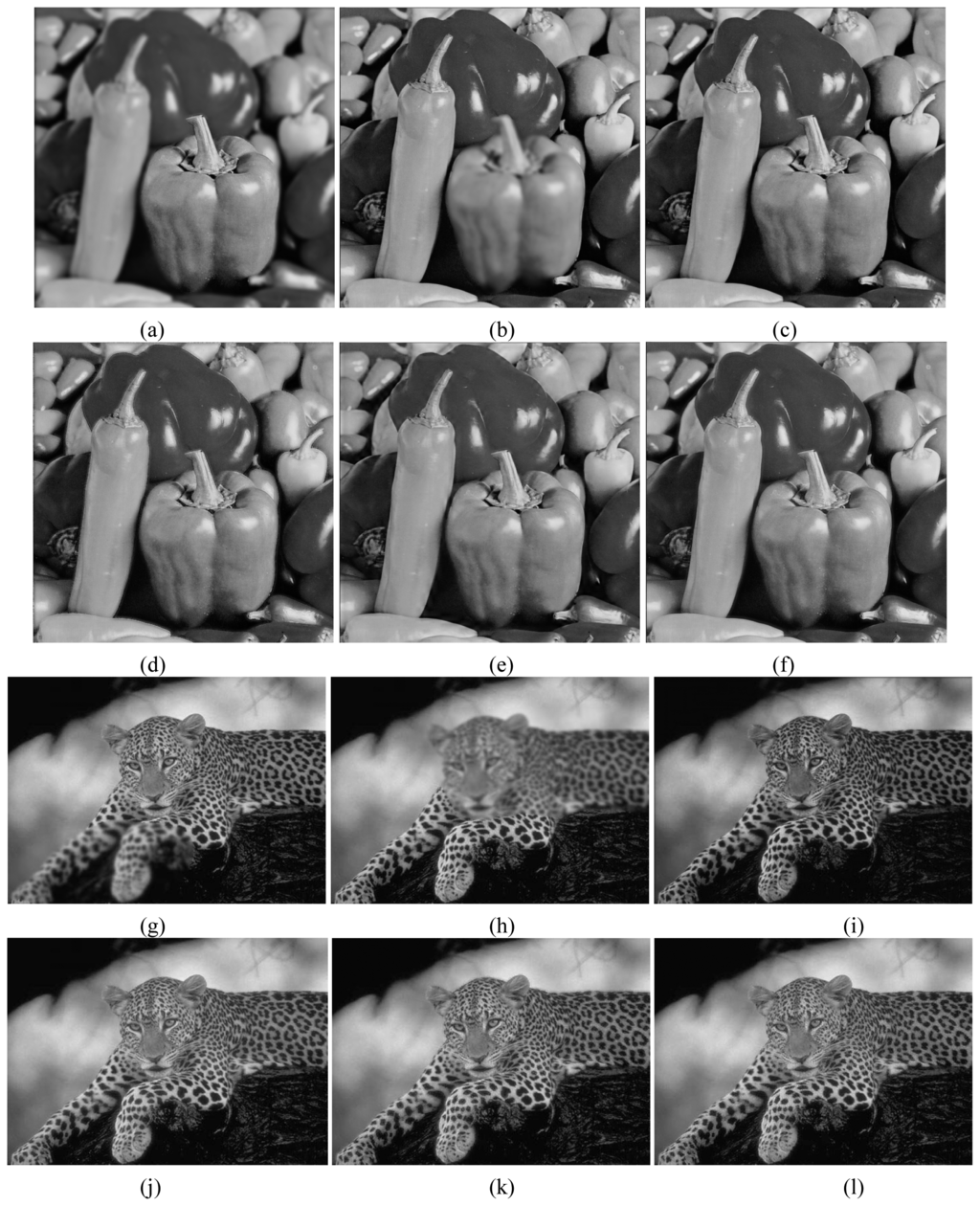 Reference images and source images of green pepper and leopard. (a) Focus on the front green pepper; (b) focus on the behind green pepper; (c) reference green pepper image; (d) fused image using AWT; (e) fused image using EMD; (f) fused image using EVM (C=5500); (g) focus on the right top part; (h) focus on the left bottom part; (i) reference leopard image; (j) fused image using AWT; (k) fused image using EMD; (l) fused image using EVM (C=6500).