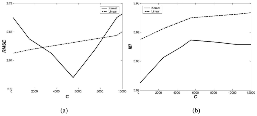 (a) The effect of the C on the RMSE; (b) the effect of the C on the MI.