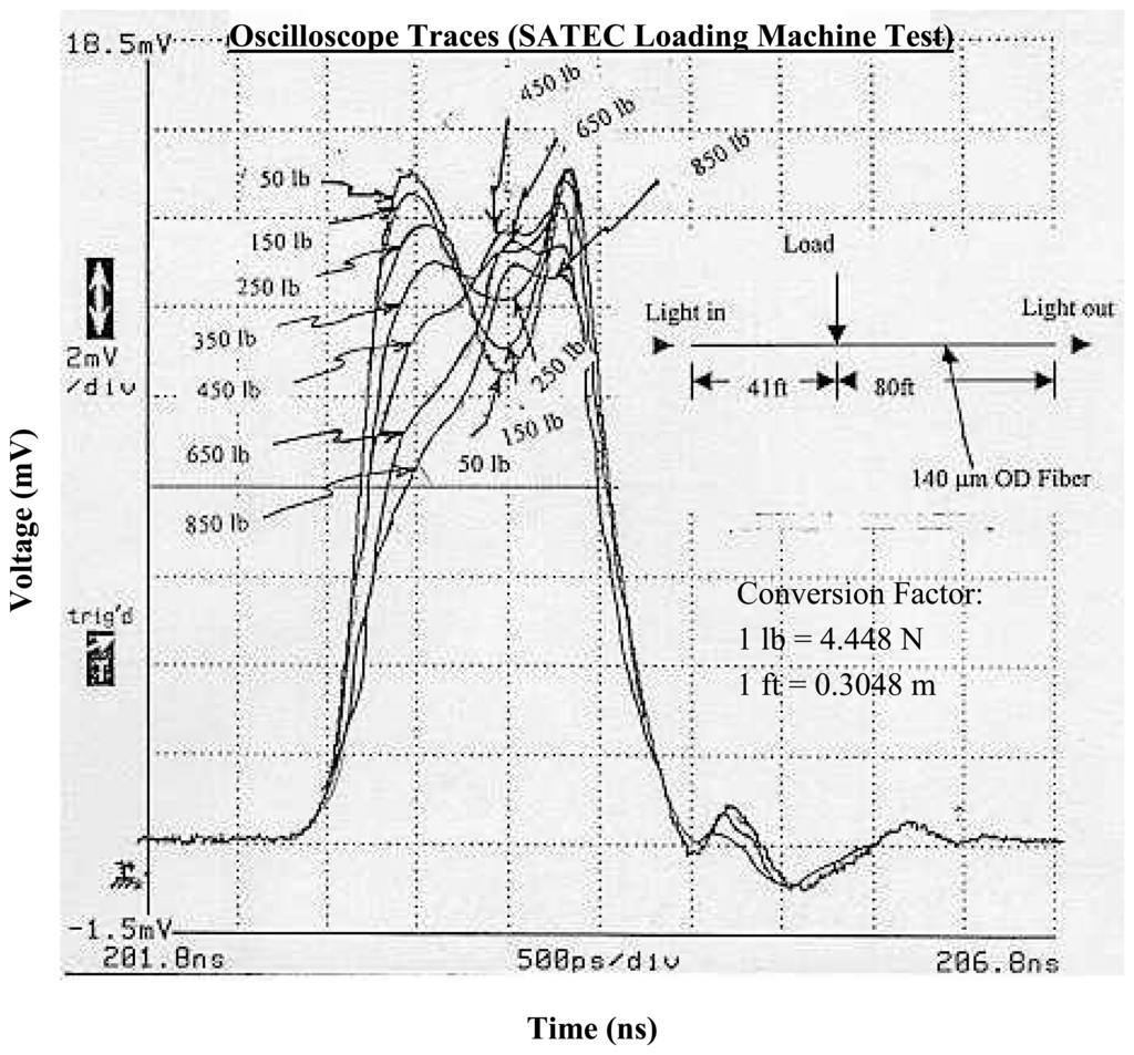 Oscilloscope traces of output light signals when the fiber is bent with the 3-pin load transfer device under SATEC loading machine (Unit conversion factor: 1 lb = 4.448 N; 1 ft = 0.3048 m)
