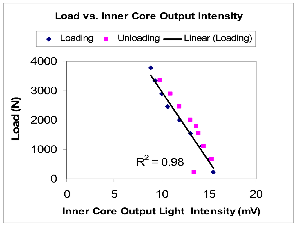In order to create a reliable WIM system, a strong relationship between the output signal and the applied load must exist. From the observation mentioned in the preceding paragraph, the more reliable pulse to track is the inner core light output pulse intensity as it decrease continuously as the load is increased (or bending is increased). The variation of the inner core light output (left peak) intensities with the applied load has been shown in Figure 12 for both loading and unloading cases. It can be seen that there is a slight difference in the data point values between the loading and unloading cases. Since the tests were done at the same environmental condition (room condition) and during a relatively short period of time (a couple of hours), this difference in measured values from the loading and unloading experiments can be attributed to the preliminary nature of the mechanical device and connection between the mechanical components, rather than the optical fiber. As can be seen from Figure 12, the linear relationship of the inner core light output (left peak) intensity to the applied load (amount of bending of the fiber) is quite strong, with the value of the coefficient determination for the regression, R2, for the linear curve fit being 0.98. Thus, the results seem to indicate that inner core light output reading is suited to adopt for the determination/detection of applied load magnitude.