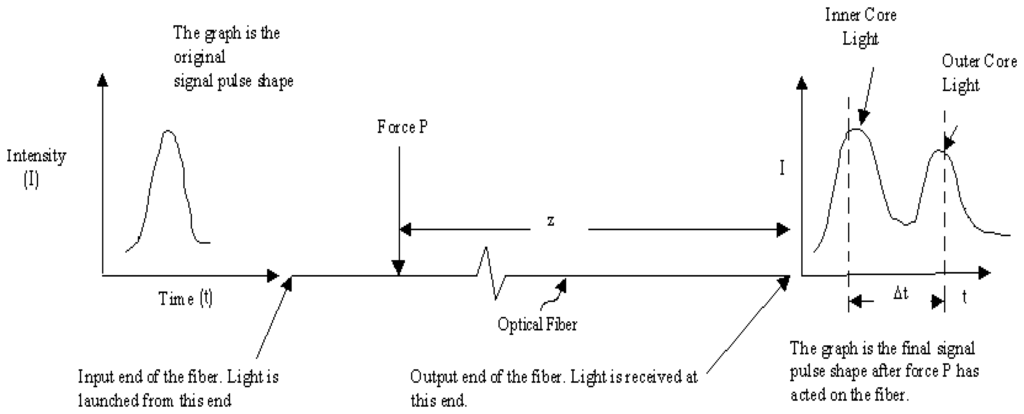 Since the refractive index of the outer light guiding region, C, is substantially greater than the refractive index of the inner light guiding region, A, the light pulses carried by the outer core will arrive at the fiber output end Δt seconds after the arrival of the undeflected light pulses transmitted by the central inner core (Figure 2). This time difference or interval is proportional to the distance of the location at which the force is applied measured from the output end of the fiber.