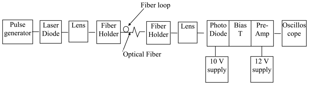 In the laboratory experiment, the interrogating light pulses were obtained by modulating the laser diode with a pulse generator (Avtech Model no. AVM-2-C). The pulsed light beam from the laser diode was focused with a lens system onto the fiber so that the light entered the inner core. Fiber holders were used to firmly position the input end of the fiber.