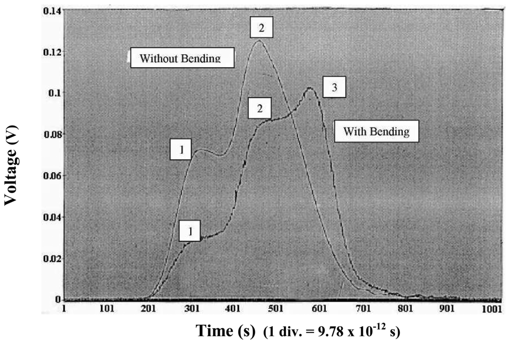 Figure 5 shows representative oscilloscope traces of the output signals from the fiber with and without bending. The oscilloscope trace with peaks 1 and 2 corresponds to the case when there was no bending. Peak 1 corresponds the output light from the inner core. The exact cause for Peak 2 could not be identified. Several possible causes could give rise of the extra peak [26, 27]. Some possible reasons for this extra peak could be attributed to the fabrication of the fiber and/or to the combination of light being launched directly from the source into the outer core (graded index multi mode region) and mode mixing of the light in this region. When the fiber was bent, the inner core light pulse (Peak 1) decreased while a new pulse (Peak 3) to the right of the inner core light pulse appeared. This light peak (Peak 3) corresponds to the light output from the outer core that was leaked from the inner core to the outer core at the bending location of the fiber.