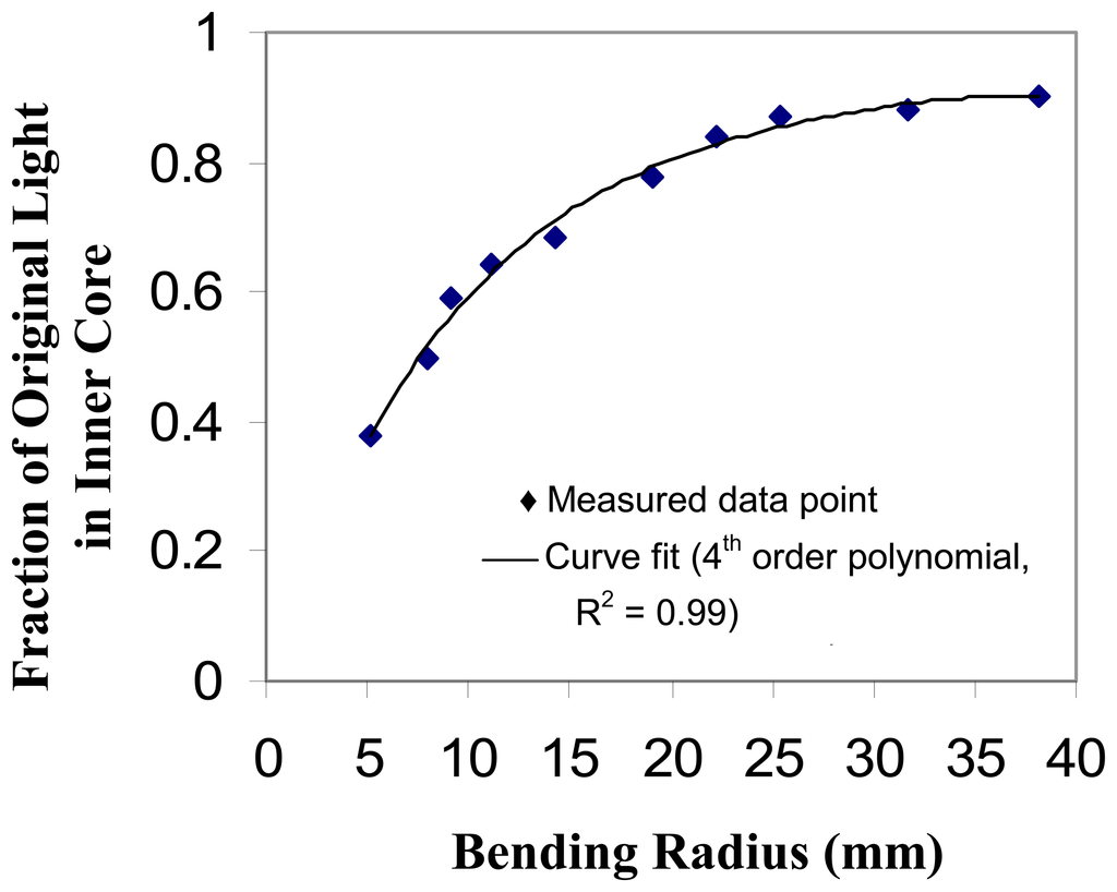 Figure 6 shows the calibration curve developed between the bending loop radius versus the amount of inner core light output (Peak 1, Figure 5) expressed as a fraction of the light intensity before the fiber was bent. It was observed that a 10% decrease in the magnitude of the light in the inner core (i.e. 90% of the original value) corresponds to a bend radius of 36 mm. A 50% decrease in light corresponds to a bend radius of 7 mm. The experiment also gave us the range of the fiber loop radius for which we get a distinct output signal. The minimum radius of circular loop that gave maximum leakage of light from the inner core to outer core without breaking was 5.5 mm. The maximum loop radius above which we did not observe any change in the inner core signal was 70 mm.