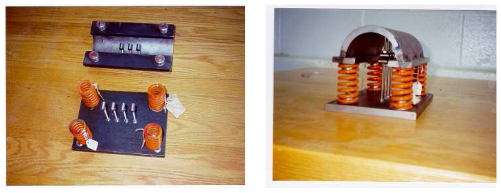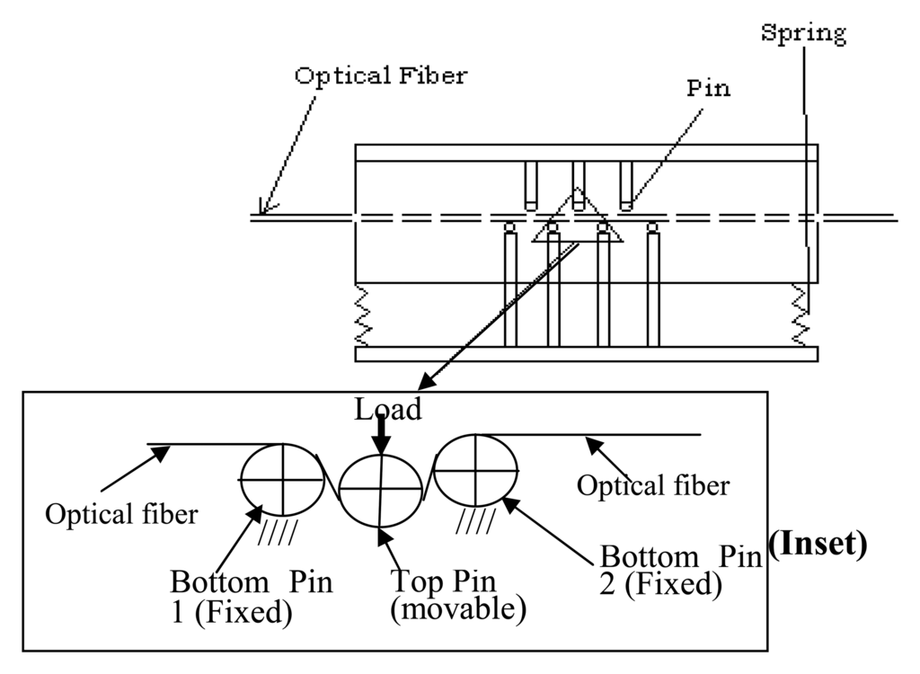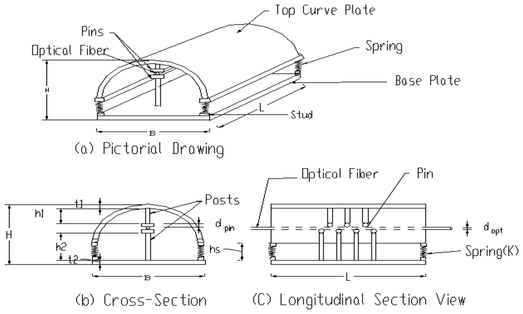 For the fiber to act as a load sensor, a device is necessary to bend the fiber when a load (e.g. a vehicle wheel load) is applied. The schematic diagrams of a laboratory load transmitting/fiber bending device used in this study are shown in Figure 7 [27-28]. The device was based on a pin and spring mechanism. It consisted of a semi-circular steel top supported by four springs supported at the four corners on a steel base plate. There were two rows of circular pins of diameter approximately 0.953 cm (0.375 in) arranged in staggered fashion. One row of pins was attached to the semi circular top and the other attached to the steel plate below. The center to center spacing between any two pins in a row was approximately 2.07 cm (0.815in). The spring constant, pin diameter, and spacing between the pins were adequately selected to introduce suitable bending of the fiber to have the proper amount of light leakage from the inner core to the outer core of the fiber.