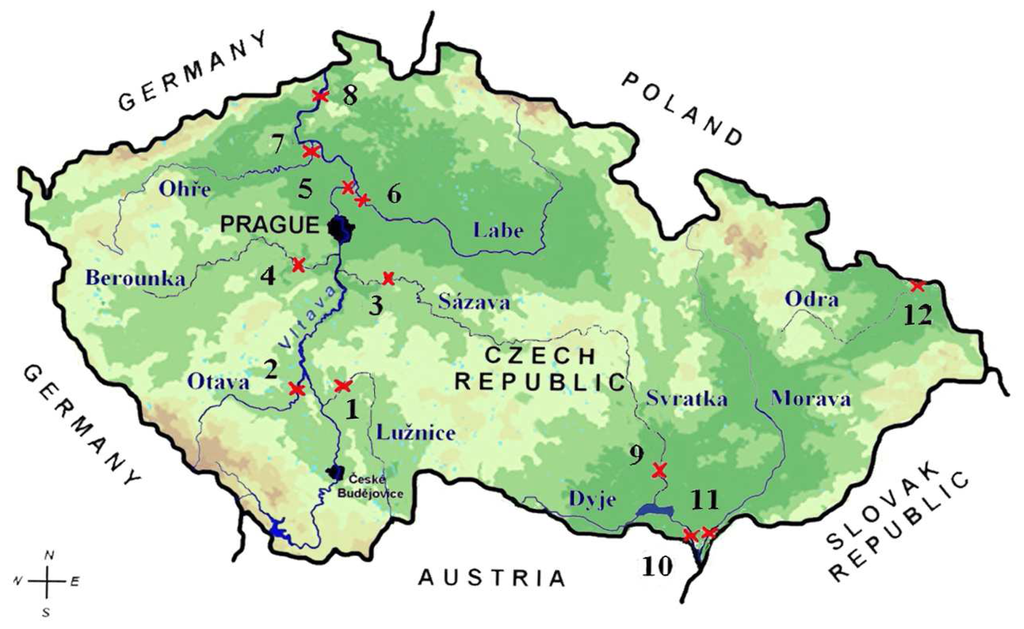 Map of the Czech Republic and locations of sampling sites (1. Lužnice (Bechyně), 2. Otava (Topělec), 3. Sázava (Nespeky), 4. Berounka (Srbsko), 5. Vltava (Zelčín), 6. Labe (Obříství), 7. Ohře (Terezín), 8. Labe (Děčín), 9. Svratka (Židlochovice), 10. Dyje (Pohansko), 11. Morava (Lanžhot), 12. Odra (Bohumín);.