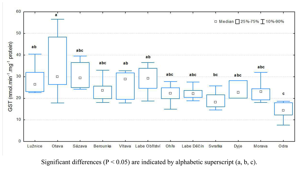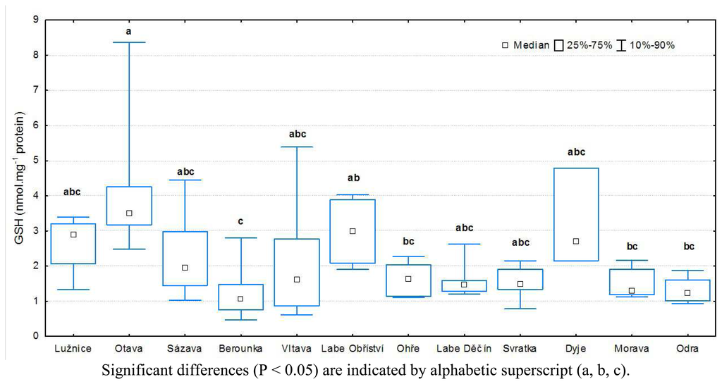 The highest activity of GST and the highest levels of tripeptide reduced GSH were detected at the locations Otava, Labe (Obříství) and Lužnice. Major inductors of the enzymes of the phase II xenobiotic detoxification and tripeptide GSH are also considered to be persistent organic pollutants: PCBs, PAHs and PCCD/PCDFs [16, 18]. Increased concentrations of total liver glutathione relative to reference sites, have been observed in English sole (Pleuronectes vetulus) collected from a PCB- and PAH- polluted portion of the Puget Sound in Washington [41] and in brown bullhead (Ameiurus nebulosus) from a PAH-polluted section of the Buffalo River in New York [42].