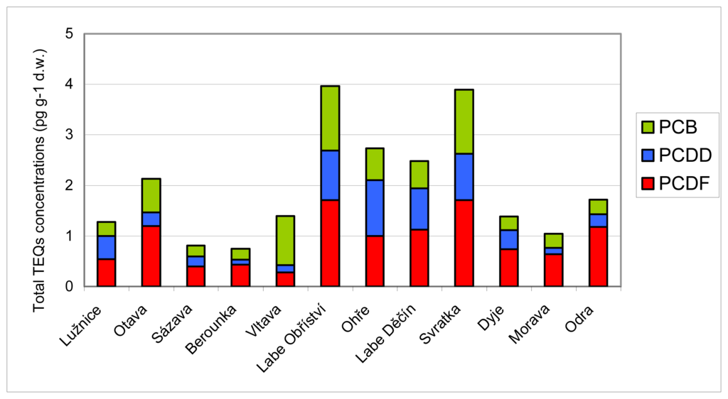 The concentrations of PCCD/PCDF TEQs in male chub muscle ranged from 0.10 (Berounka) to 1.10 pg g−1 dry weight (d.w.) (Ohře) and from 0.27 (Vltava; to 1.71 pg g−1 d.w. (Labe Obříství and Svratka), respectively. The concentrations of PCB TEQs in male chub muscle ranged from 0.21 (Berounka) to 1.28 pg g-1 d. w. (Labe Obříství). Total TEQs concentrations (Σ of PCDD/PCDF and PCB TEQs concentrations) in male chub muscle ranged from 0.74 (Berounka) to 3.97 pg g-1 d. w. (Labe Obříství;. The toxic equivalents of analysed chemicals are shown in Figure 7. No correlation with biochemical markers from individual sites was performed because of the combined chub muscle samples.