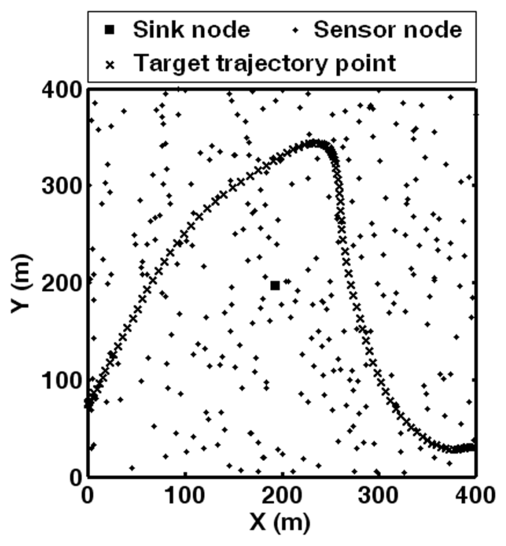 The two-dimension sensing field is filled with randomly deployed sensor nodes. Their positions are provided by a global positioning system (GPS). A sink node is located in the centre of the sensing field. Sensor nodes sense collaboratively within a specified sensing period []. As the historical target positions become available, the sink node can forecast the target position of the next sensing period.