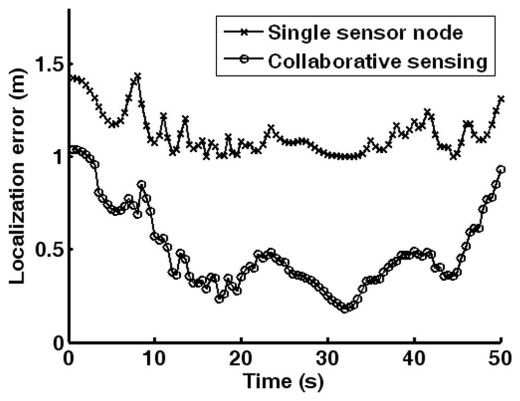 Comparison of target localization error with collaborative sensing and single sensor node.