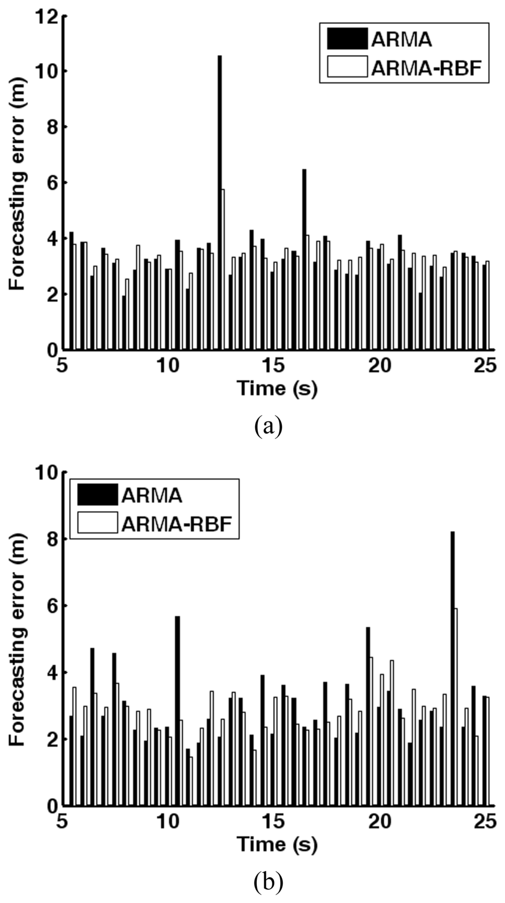 Target position forecasting error of ARMA and ARMA-RBF in the coordinate frame XOY: (a) X direction; (b) Y direction.