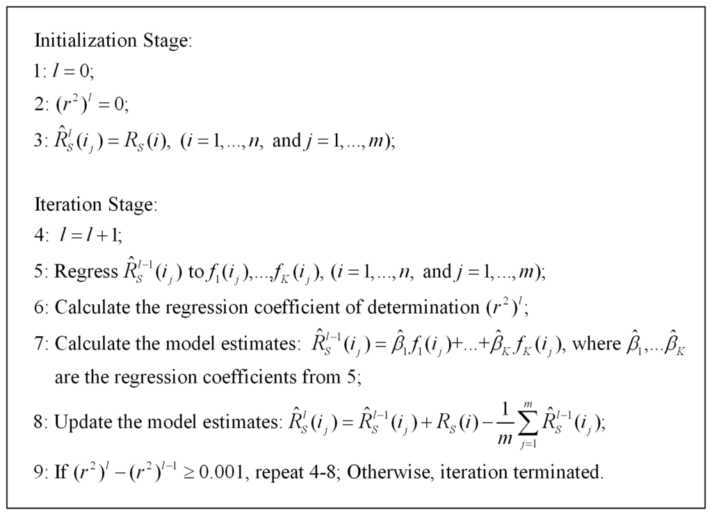 The iteration proceeds until the difference in the regression coefficient of determination r2 between two continuous iterations falls below a threshold value (e.g. 0.001).