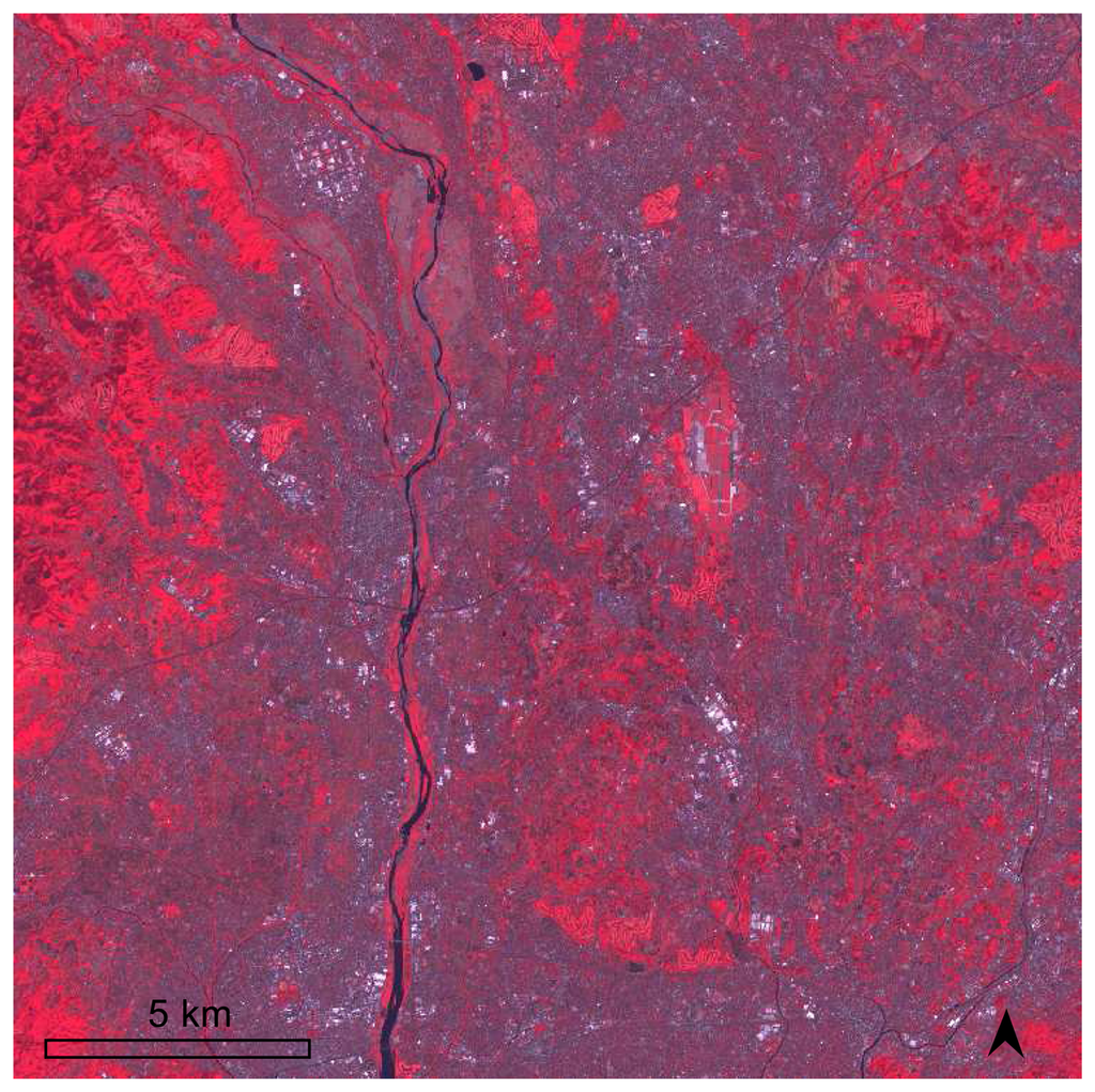 The TIR radiance used to test our downscaling methods is from Advanced Spaceborne Thermal Emission Reflection Radiometer (ASTER). ASTER is one of the major satellite sensors used for land surface temperature retrieval [18]. It has 14 multi-spectral channels including three visible and near infrared (VNIR) channels with 15-m spatial resolution, six short wavelength infrared channels with 30-m spatial resolution, and five TIR channels with 90-m spatial resolution. ASTER level-1B data acquired on April 25, 2004 were collected in our study area, Yokohama City in Japan. The study area covers most inner portion of the city with most representative land use/land cover (LULC) types from the central business district (CBD) to suburban to rural areas in Japan. A false color display of the 15-m ASTER VNIR imagery of the study area is shown in Figure 2.
