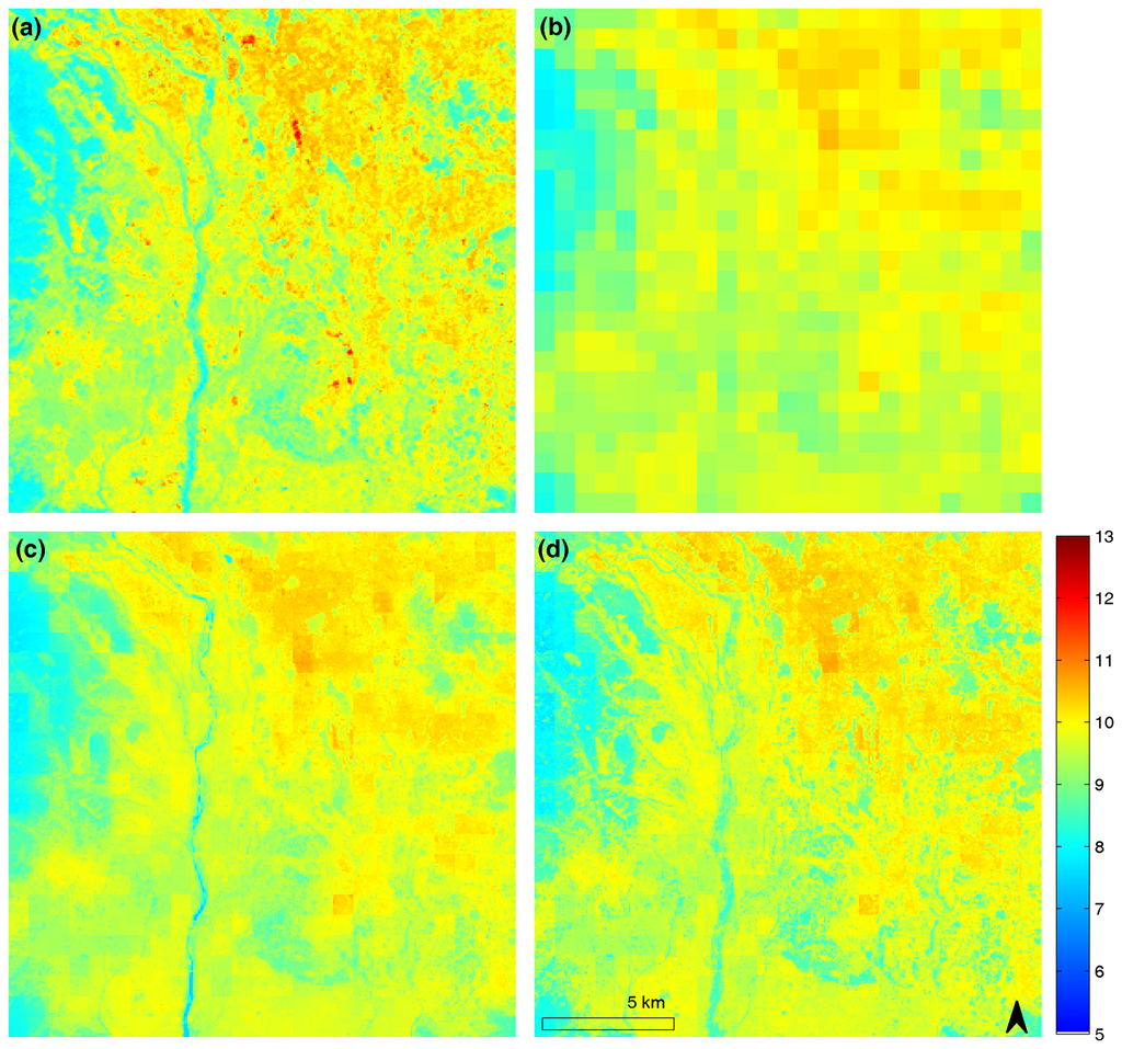 To evaluate the proposed downscaling methods, multi-resolution TIR radiances in a particular spectral region acquired at the same time and location are needed for validation. We simulated multi-resolution thermal data by upscaling the ASTER channel 13 from the original 90-m resolution to 990-m resolution. This allows us to apply the proposed methods to downscale the 990-m thermal data back to 90-m resolution, which will then be validated against the original 90-m thermal data. Specifically, the TIR radiances were upscaled by averaging every 11 × 11 TIR pixels at the 90-m resolution to one pixel at the 990-m resolution [7]. The simulated 990-m ASTER TIR imagery was shown in Figure 3(b). In addition to the simulated TIR radiances, LST at the 990-m resolution is also needed in the physical model. Unlike the TIR radiances, the upscaling function for LST is much more complicated than just a simple average [7]. Therefore, we used the 1000-m MODIS LST products acquired at the same time as the ASTER data over the study area as a good approximate in the physical model.