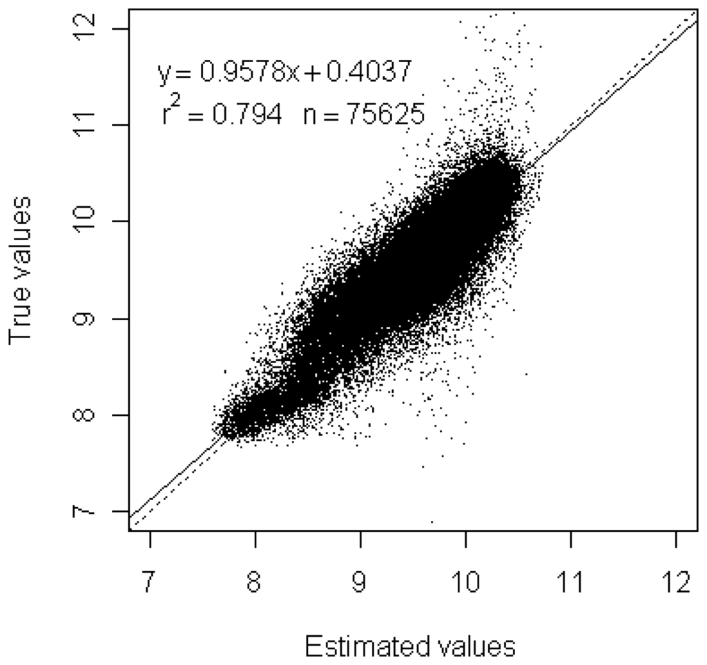 When the model parameter estimates obtained at the resolution of 990-m were applied to land cover fractions at the spatial resolution of 90-m, the 90-m TIR radiances were obtained. After bias correction (see Equation (7)), the final model estimates of the 90-m TIR radiances were shown in Figure 3(c). A visual comparison revealed that (1) the general patterns of the 90-m TIR radiances in Figure 3(a) were well captured in Figure 3(c); and (2) considerable spatial details in Figure 3(c), which were originally unresolvable in Figure 3(b), appeared in Figure 3(c). However, some hotspots (pixels with high TIR radiances) depicted in red in Figure 3(a) were not captured in Figure 3(c). This is due to the fact that there is a lack of individual patches (hotspots) comprised by more than 11 × 11 pixels of the 90-m resolution in the original thermal image. Additionally, a small portion of the map in Figure 3(c) illustrated some smoothing and blocking effects, which might be a consequence of the assumption of isothermal pixel. Further comparison between the model estimates and the true values (i.e. the observed 90-m TIR radiances of ASTER channel 13) is illustrated by a scatter plot in Figure 4. The scatter plot showed that most of the points lied along a 1:1 line (dotted line) with only a small portion of points departing far from the 1:1 line, indicating a general good agreement between the physical model estimates and the true values. To evaluate the results quantitatively, a simple linear regression model was fitted between the estimated values and the true values using all the 90-m pixels (n = 75625). The results demonstrated that the estimated values matched very well with the true values as evidenced by (1) a very high coefficient of determination (r2 = 0.777), (2) the closeness of the fitted line (solid line) and the 1:1 line in the scatter plot, and (3) a small residual standard error (0.2831).