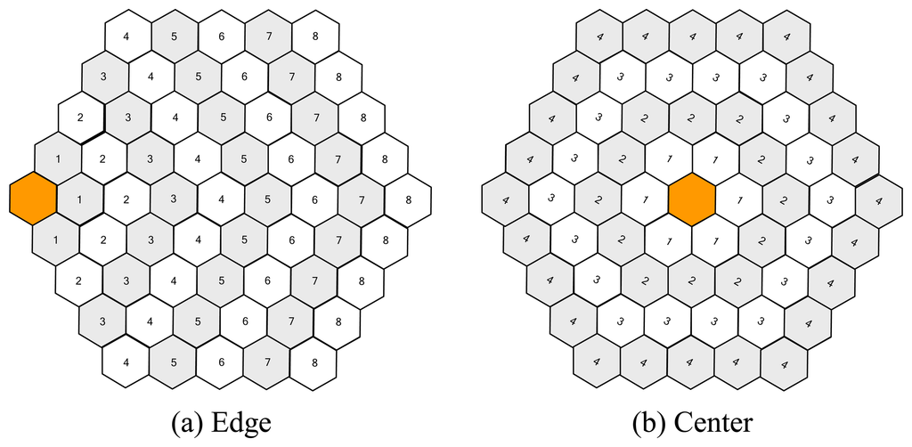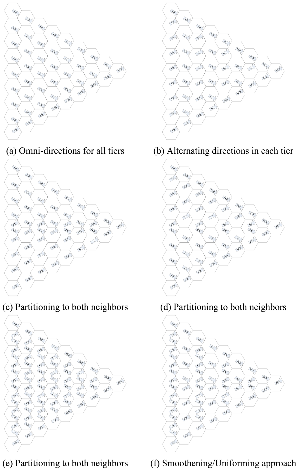 Figure 5c shows this case, and we can see that the nodes have smoother load, except the nodes in the innermost tiers, where the nodes in the middle have more load than the others. It seems that the load of the edge nodes in (a) and (b) are shifted to the intermediate nodes in this case.