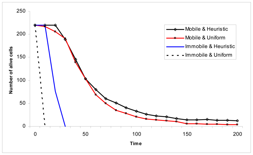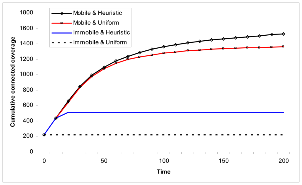 We created various simulation models to measure the affects of changing relocation cost to be between { 0 … 1,000 }, mobility capability of sensor nodes as { mobile, immobile }, deployment type as { uniform, heuristic }, node density in each cell as { 1 … 50 }, and time; in order to see their affects on the amount of Cumulative Data Transferred to the Cluster head before the death of the network, Number of Alive Cells at Different Times, and Cumulative Connected Coverage of the network.
