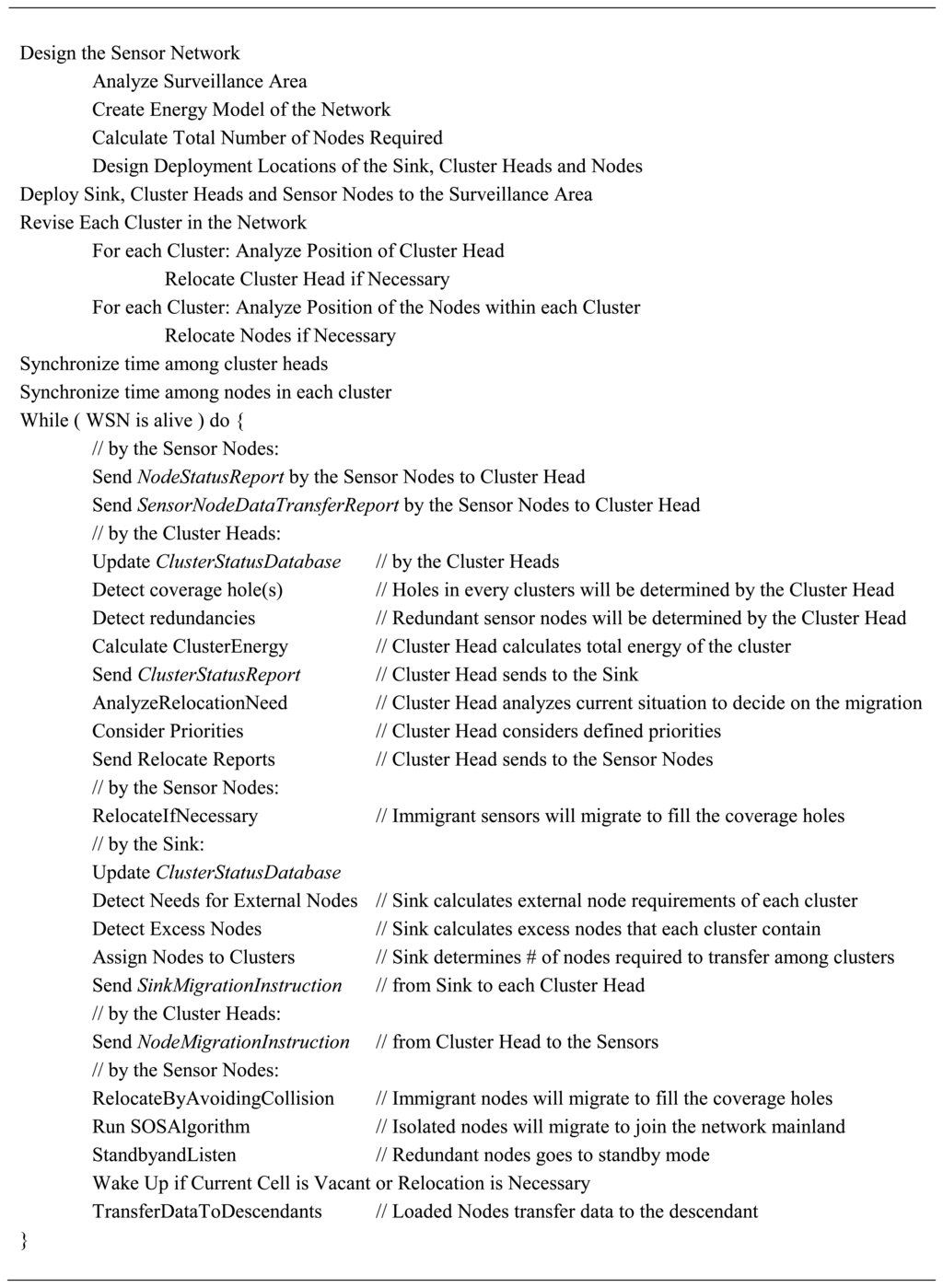 Adaptability to changes in the mission statement: The algorithm should be robust for possible changes in mission parameters such as shift in location of the surveillance area, or changing priorities of different clusters. Sensor nodes may be required to move not only for healing the coverage holes occurred in the network, but also for satisfying the updated mission requirements.
