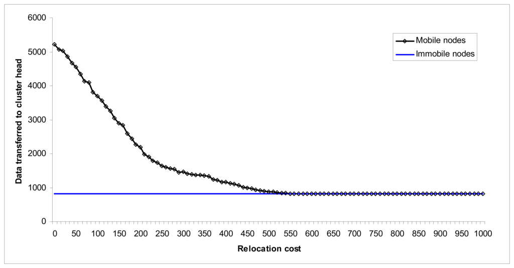 Figure 7 shows the amount of data packets those arrived to the cluster head before the network dies, i.e. no living node remains. Immobile network generates same amount of (823) data packets independent from the relocation cost, since relocation cost is irrelevant for immobile nodes. In mobile network, total arrived packets are very high for low relocation costs (4559 when relocation cost equals 50, for example) and decreases as relocation cost increases until it is equal to 560 units. Mobile and immobile networks perform equal if relocation cost is higher than 560. Beware of the fact that 560 is more than half of the total initial energy capacity (1,000) of a node, which is not a practical value. For a relatively low relocation cost, mobile network seems to be a very good choice.