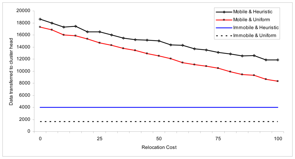 We want to measure the affect of the deployment types together with the mobility. Hence, uniform and heuristic deployments are tested against relocation cost. To see this, we re-created the previous model, by using 220 cells per cluster instead of 60, and 2 nodes per cell, instead of 1, which adds up to 220*2=440 total number of nodes within each cluster. We again measured data transferred to the cluster head until death of the network.