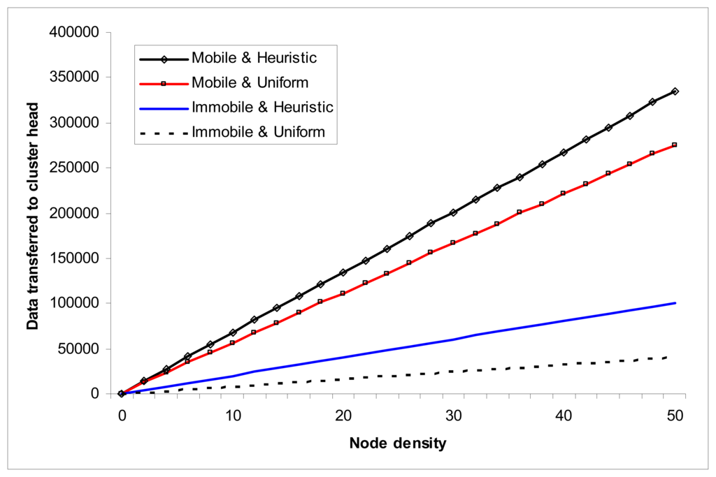 In this model, we measure the effect of node density (number of nodes per cell) to the total number of data transferred to the cluster head before network dies. We simulated both mobile and immobile networks as well as uniform and heuristic deployments, and depicted the results together in