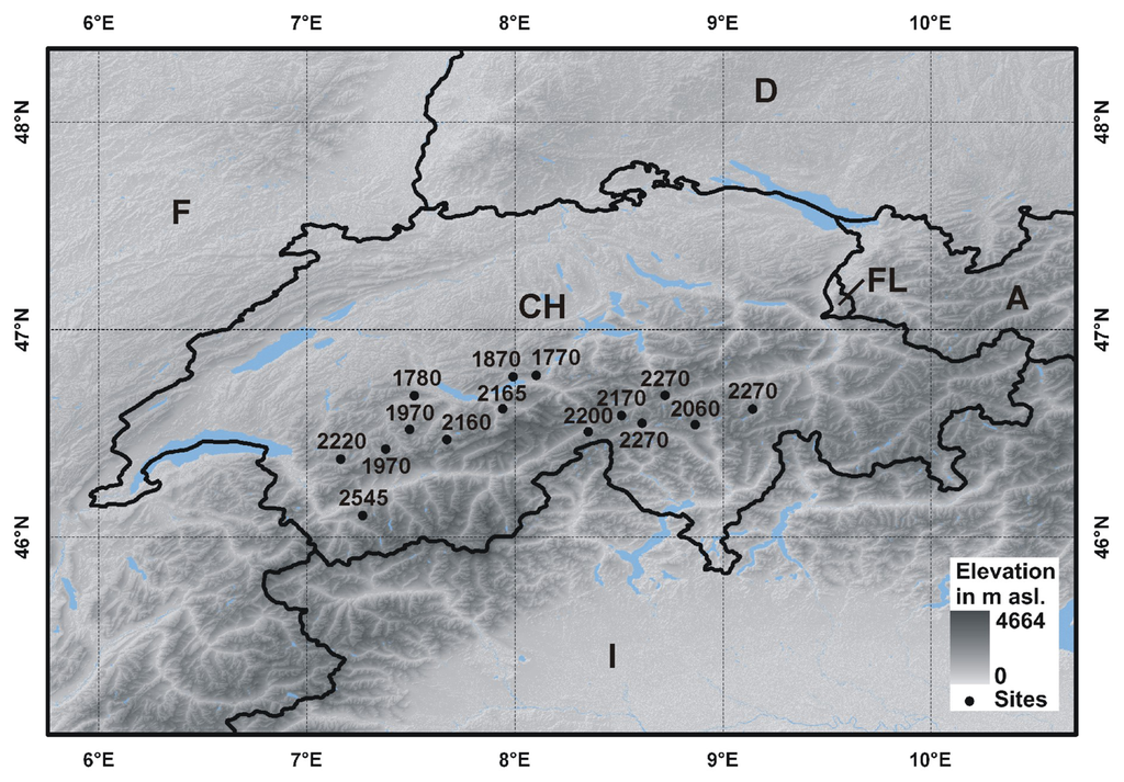 Spatial distribution of the sites (black dots) in Switzerland. All sites represent subalpine and alpine grassland (modified from [31]). The numbers associated with the black dots indicate site elevations above sea level [m].