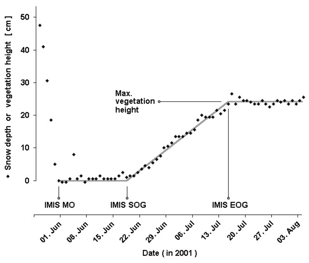 Only a brief overview of the ground data set is provided here. For detailed information we refer to Jonas et al. [31]. The IMIS network is a meteorological network that has been run by the Swiss Federal Institute for Snow and Avalanche Research (SLF) since 1996 [30] and that has since then recorded snow and climate variables such as snow depth, air temperature, wind speed, and soil temperature in 30-minute intervals. More than 100 stations were installed throughout the Swiss Alps. Snow depth is measured from above with an ultrasonic snow depth sensor (mounted on a mast 6 m above ground), which can also track vegetation height during summer. 15 out of 105 stations were identified to best feature undisturbed subalpine and alpine grasslands with a homogeneous vegetation of at least 10 cm height at full growth. The sites are distributed throughout the Swiss Alps and range from 1770 to 2545 m a.s.l. (Figure 1). The combination of meteorological and phenological information at the IMIS sites provides an excellent opportunity to study alpine grassland phenology. IMIS dates or indices were computed by fitting the growth signal with a 3-leg linear fit (bold line, Figure 2): melt-out date (IMISMO), which can be regarded as the start of season, start of height growth (IMISSOG), and end of growth (IMISEOG), which corresponds to the date where maximum plant height is reached. Leaf unfolding after melt-out did typically not result in any detectable height growth until two to three weeks after melt-out, when the onset of vegetation height growth (IMISSOG) was observed. IMISSOG was followed by a nearly linear growth until maximum vegetation height was reached (IMISEOG) in early summer (Figure 2).
