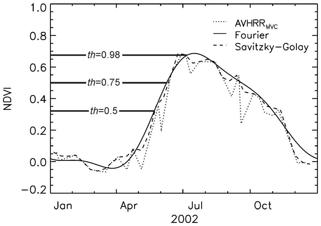 Even though the differences in r and σ between the two smoothing approaches were mostly statistically insignificant, results as summarized in Table 2 suggest that for our purposes the Fourier algorithm was more efficient in eliminating undesirable noise from the NDVI time series. Since Savitzky-Golay NDVI products closely follow the composite NDVI times series (Figure 3), they are more sensitive to short term NDVI variations and therefore more susceptible to noisy data. This is most clearly reflected in EOG detection by means of the Savitzky-Golay filtered NDVI time series, where linear correlation coefficients were lowest and OD standard deviation values highest among all investigated cases: noisy time series during the growing season led to multiple local NDVI maxima. Since thresholds for the determination of EOG were found to be close to th=1.0 (i.e. NDVIMAX), the chance that EOG was attributed to the wrong NDVI peak was high. This issue underlines a drawback of the threshold methodology (Section 2.4), i.e. that the determination of phenological dates from NDVI time series using a fraction of the maximum annual NDVI amplitude may be influenced by errors in the magnitude and timing of both bounding values. Third order Fourier series on the other hand can only track changes in vegetation with a periodicity of 4 months and are therefore less susceptible to noisy composite time series. Residual noise in the Fourier adjusted NDVI time series could be avoided by choosing lower order Fourier series, however, we argue that third order Fourier series represent a good trade-off between noise removal on the one hand and representation of natural NDVI short term variations on the other hand.