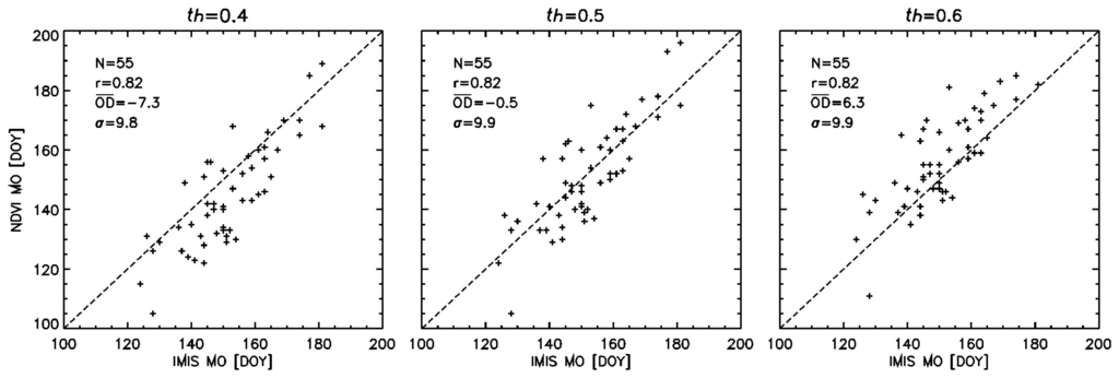 adopted positive values where th was chosen too high. Figure 4 addresses this issue, showing an example of a relationship between satellite and ground data where th was chosen too low (left), nearly optimal (middle) and too high (right). In the first case the majority of the points are below the 1:1 line, gradually shifting upwards with increasing thresholds (middle and right). OD for each point is given by its vertical distance from the 1:1 line. The scatter as seen in the subplots of Figure 4 was therefore described as the OD standard deviation (σ in Figure 4 and Table 2) in addition to the linear correlation coefficient r. These analyses were carried out for eight NDVI data sets from all 4 products (AVHRR, VGT, MODIS 500 m, and MODIS 1 km), each smoothed with both filter methods (i.e. Fourier adjustment and Savitzky-Golay filter; Table 2). Differences in correlation coefficients were tested performing the Fisher r-to-z transformation, standard deviations of the offset in days by means of the F-test. In the following, p-values of p < 0.01 were termed as highly statistically significant and p < 0.05 as statistically significant.