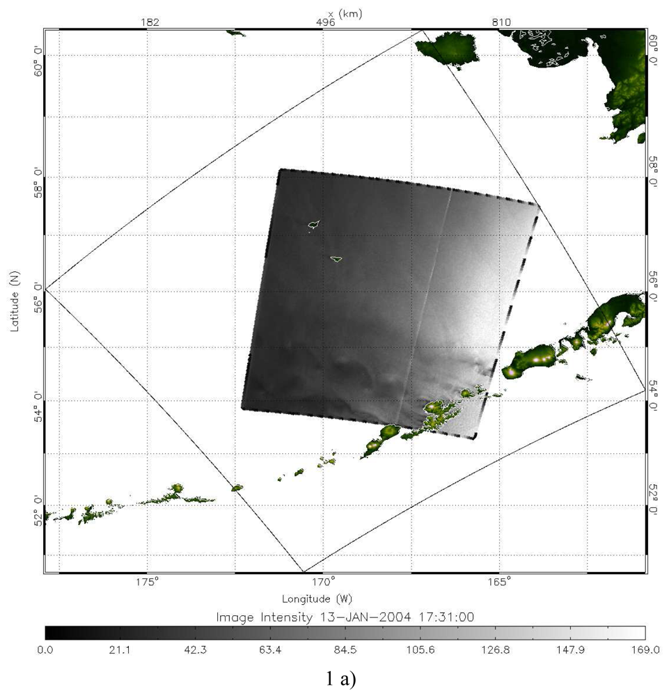 The SAR image depicted in Figure 1b is shifted slightly to the south, which is centered at about 54.0°N, 168.5°W and was acquired at 04:56:34 UTC on January 14, 2004, about 11 hours after the first SAR image (Figure 1a) was taken. Three pairs of distinctive vortices shedding in the lee of Mount of Recheshnoi and Mount Vsevidof, Alaska were also observed. The distance between two vortices in the downstream direction was about 64 km and 73 km, respectively. This vortex street showed irregular, with an unsymmetrical structure with well-structured vortices on the left side but poorly formed vortices on the right side. Oscillatory-type wake patterns are observed downwind of the Unalaska Island and the Tulik Volcano of Umnak Island.
