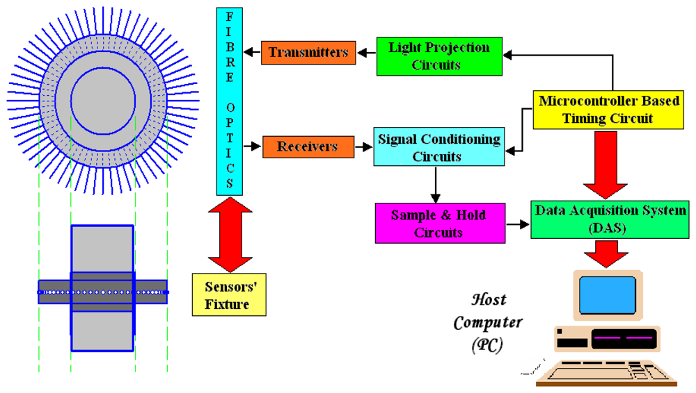 A typical Optical Fibre Process Tomography (OFPT) system consists of the sensor's array, signal control and conditioning circuit, data acquisition system (DAS) and also the display unit, namely the computer. Topology of the constructed hardware system in this research is illustrated in Figure 1.