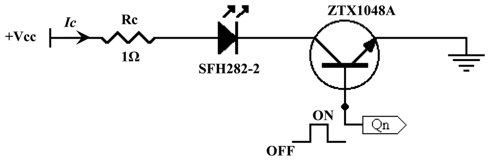 From Figure 10, the point Qn at the base of the transistor is connected to the decoder in the signal control circuit. The n represents the n-th decoder output pin as there are 32 individual infrared projection circuits. Base current determines the ‘on’ and ‘off’ state of the projection circuit. Positive pulse that is supplied will activate the projection circuit while negative pulse will deactivate the circuit. This operation mode is known as the pulsed mode. The emitter is operated in pulsed mode because it can handle a larger current and hence generate a greater intensity of radiation [7]. For example, for a certain infrared, if applied with continuous current, the maximum achievable forward current is 100mA while pulsed current might be able to withstand forward current up to 1A for 5ms [13].