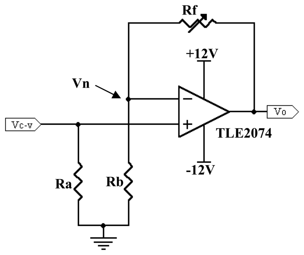 Since the differential voltage is zero, Vn = Vc−v and thus, the output voltage can be obtained as referred to Equation 5 (Boylestad and Nashelsky, 1999), with Vo, Vc−v, Rf and Rb parameters are as defined earlier.