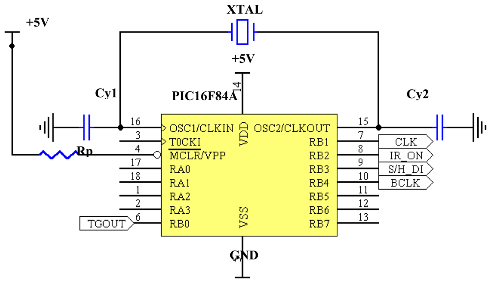 The main motivation to use the PIC16F84A microcontroller is because the device has sufficient requirements to support the needs of this project. In this signal controlling circuit that has been designed, the micro controller is used to control the duration of light projection, sample and hold digital input and data acquisition system (DAS) synchronization signals. The circuit connection of the microcontroller is shown in Figure 13.