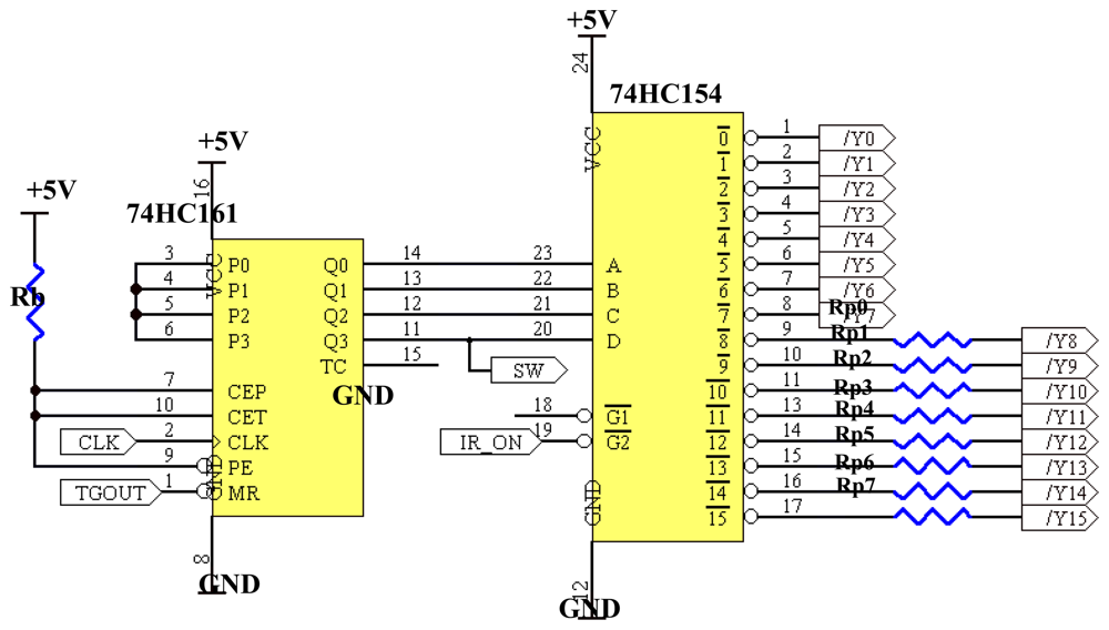 CLK is the heartbeat to the signal control circuit and is connected to the 74HC161 binary counter while IR_ON will determine the duration of 74HC154 decoder to activate its output to control the light projection circuit. Since the outputs of the 74HC154 have active low outputs [16], the 74HC04 Inverters is being used to toggle the decoder outputs from low to high before connecting to the base of transistors Qn in the infrared projection circuits. The 74HC04 has six independent inverters [18] and since there are sixteen outputs for the decoder, a total of three inverter chips are needed. The basic connection circuit for the binary counter and the decoder is exemplified in Figure 14.