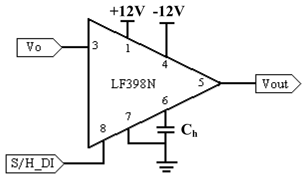 The choice of hold capacitor is important as droop rate is part the major trade-offs in the selection of a hold capacitor value. The leakage of electrolytic and the transient behavior of ceramics rule them out completely in this application. The best choice is probably polypropylene, and after that polystyrene or Mylar [23]. Everything necessary for the S/H except the hold capacitor can be put on chip, so monolithic sample-and-hold circuits, like the LF398, are available and very easy to use. The S/H command is given through a digital logic level, so these circuits interface directly with logic. Besides that, the LF398 has a hold step of less than 1mV, has an acquisition time of 4μs, features high input resistance and also has a low output resistance. Based on these advantages, the LF398 is selected for this research. The S/H circuit is illustrated in Figure 16.