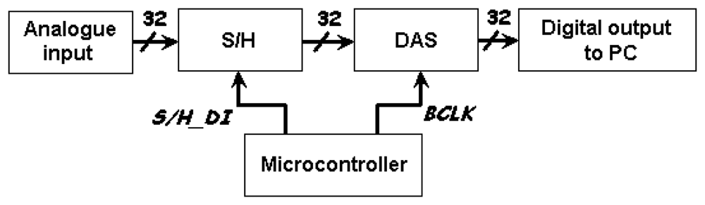 Analogue input from the hardware system goes through the sample and hold circuits before being sent to DAS for analogue to digital conversion. The S/H_DI sends a signal from the microcontroller to the S/H circuit to sample all output signals for a short period of 10μs and then continue to hold the sampled output signals until it receives the next rising edge. At the same time when the S/H signals are on hold, the BCLK signal will send a positive edge signal to the DAS to start data conversion as shown in Figure 18. The total duration of the data conversion time depends on the maximum burst mode clock frequency of 333 kHz in for this DAS.