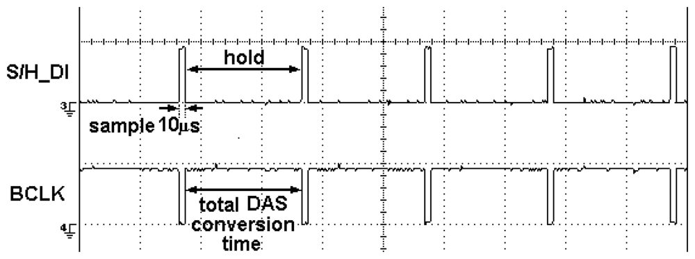 Meanwhile, the rising edge of S/H_DI will set S/H signal to ‘1’ to sample all output signals for a short period of 10μs and then continue to hold the sampled output signals until it receives the next rising edge. At the same time when the S/H signals are on hold, the BCLK signal will send a positive edge signal to the DAS to start data conversion. The total duration of the data conversion time depends on the burst mode clock frequency of 333 kHz in for this DAS. At the minimum sampling time of 3ms, the ideal conversion time would be 96μs; however due to the delays occurring while sending data to the DAS and the practical sampling time of 5μs, the conversion time is set at 390μs to ensure all data are converted properly.