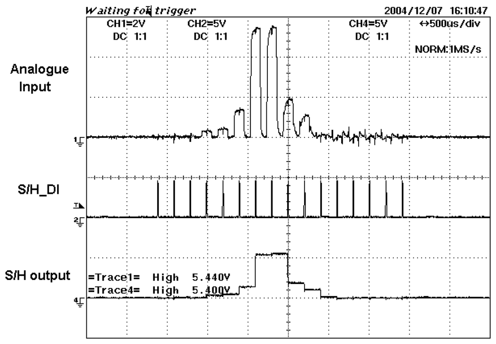 From Figure 16, the Vo is the analog output voltage after amplification from the signal conditioning circuit, while the SSH_DI is the digital logic signal generated by the microcontroller. Ch is the hold capacitor which has a value of 1.5nF and Vout is the output voltage for the sample and hold chip.