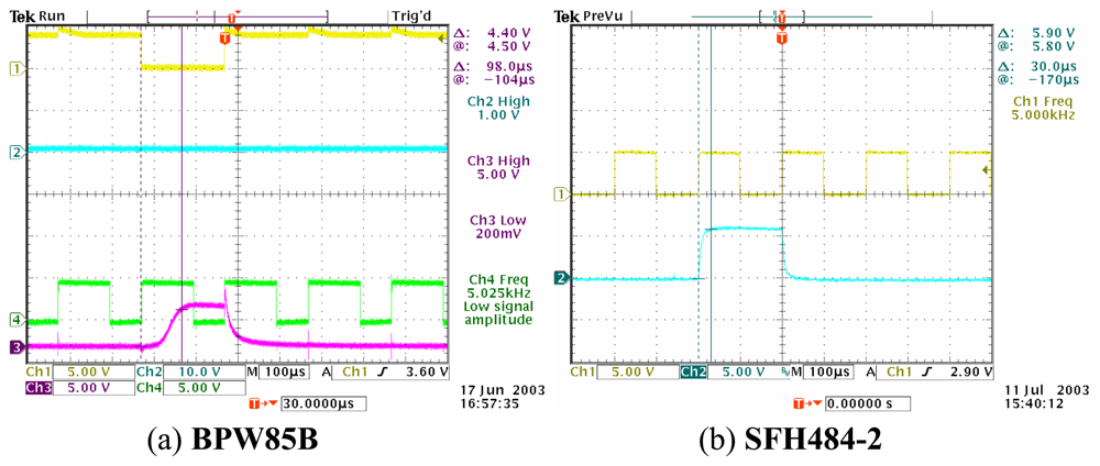 Obviously, the SFH484-2 photodiode (with a transient time of approximately 30μs and fall time also about 30μs) has a faster switching time than the BPW85B phototransistor (with a transient time of approximately 98μs and fall time of about 60μs). It is thus proved that the photodiode is more suitable to be used in this research compared to the phototransistors due to its fast transient and fall time.