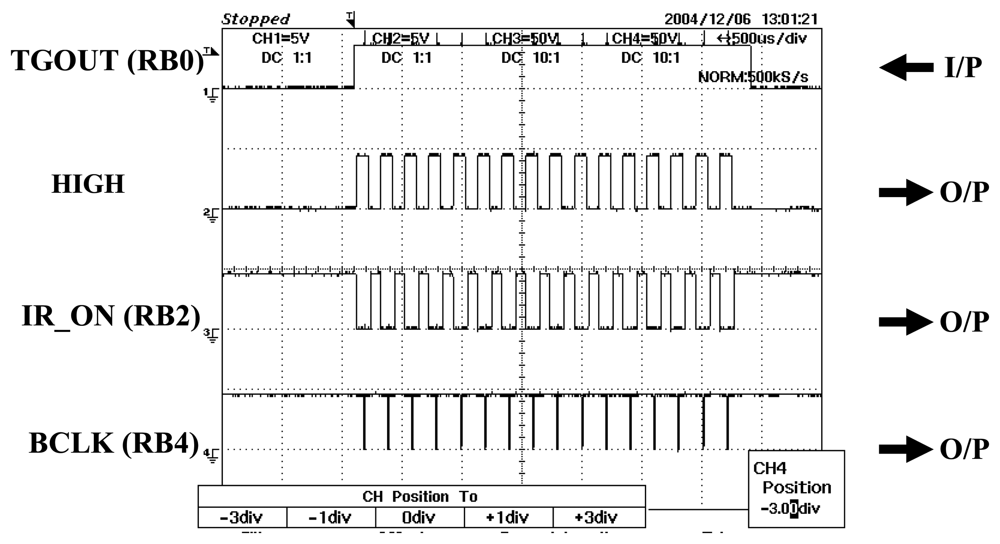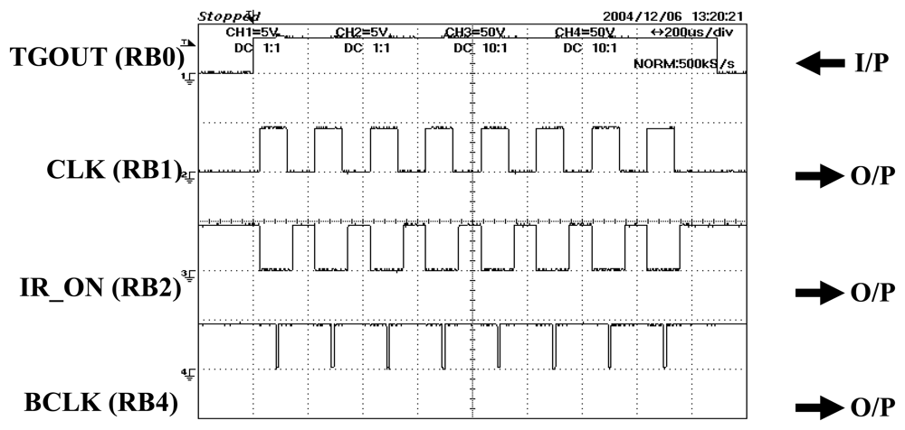 Basically, the microcontroller remains in idle state (‘0’ state) until the PC sends a signal to request the DAS to start acquire data (‘1’ state). When the microcontroller is activated by the input signal, it will produce signals according to the programmed pulses. The PIC16F84A is programmed for two different modes for both the 2-projection mode and the 4-projection mode. In the 2-projection mode, the decoder requires 16 pulses to operate while the 4-projection mode needs only 8 pulses to function as shown in Figure 22 and Figure 23.