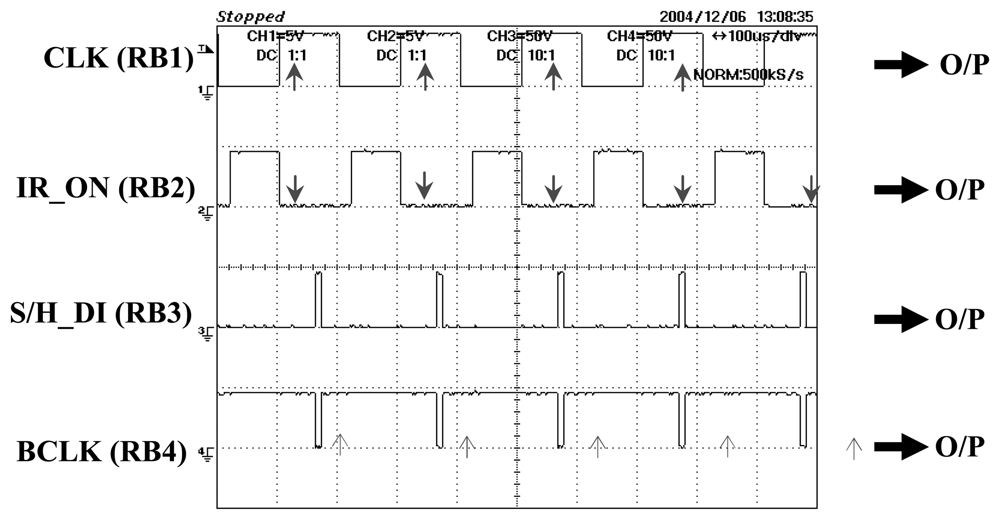 pin accidentally. This resistor, whose value is selected as 4.7kΩ and its function is to keep a certain line on a logical one as a preventive, is called a pull up. Meanwhile, the XTAL is the crystal oscillator and the value of this crystal used is 2MHz with two ceramic capacitors (a value of 22pF each). For the I/O pins, RB0 functions as an input pin (TGOUT input from the DAS) while RB1, RB2, RB3 and RB4 are output pins for clock (CLK), signal to control the duration of ‘on’ and ‘off’ state of the infrareds via decoder (IR_ON), digital input control of sample and hold circuit (S/H_DI) and also the burst clock to signal DAS to start its data conversion process (BCLK).